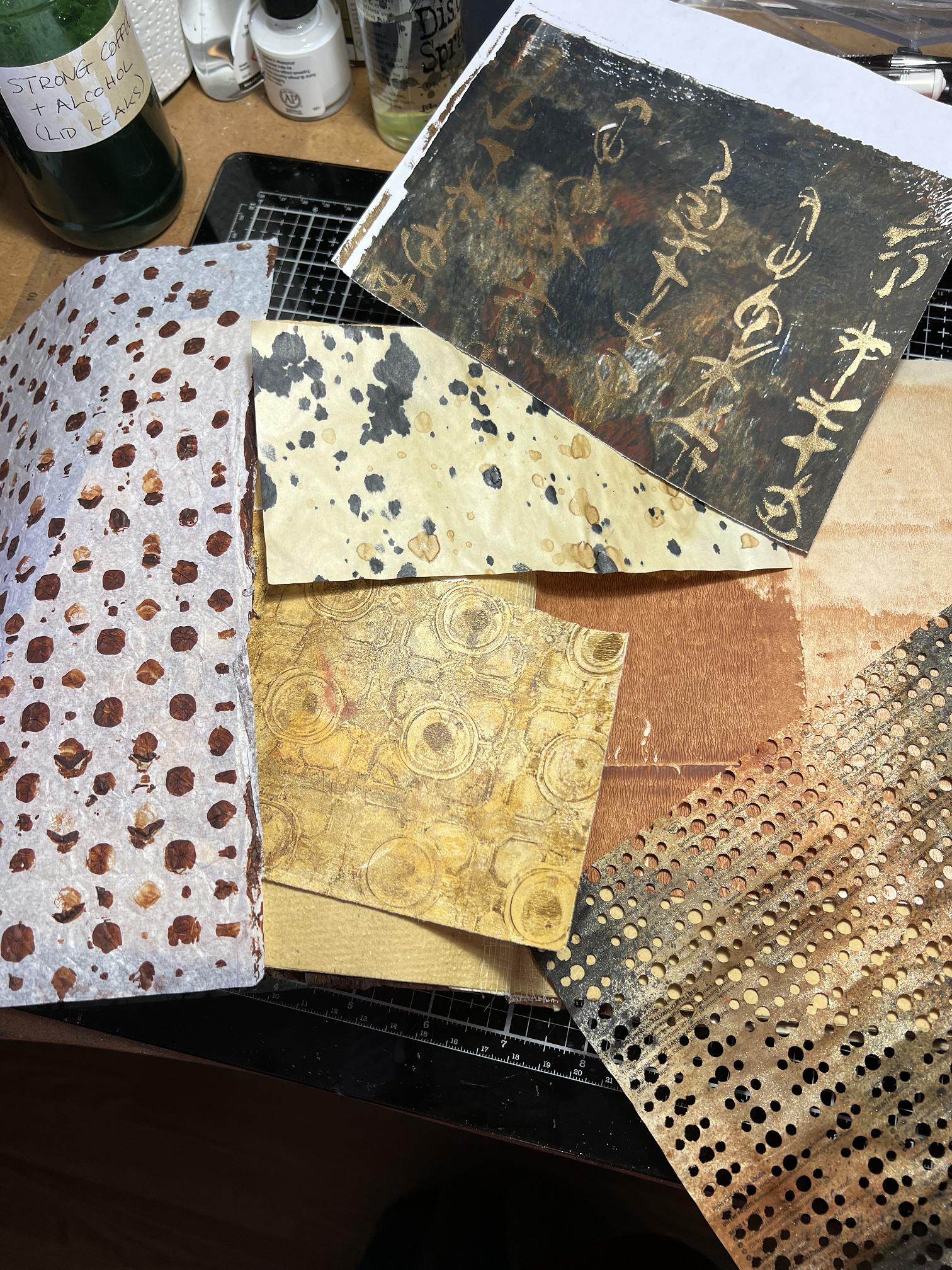 In the “selecting the papers” photo, underneath this and to the right is a gorgeous piece that happened by accident – I used the paper to clean off the brayer and just loved the effect. On top of it and to the left is a piece of bathmat gel printing, and on the left, a piece of tissue that I used to remove paint from the holes in one of my sink mats placed over the gel plate covered with brown paint. The pierced paper is, of course, at bottom right.