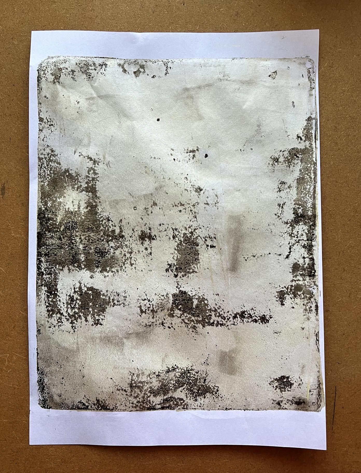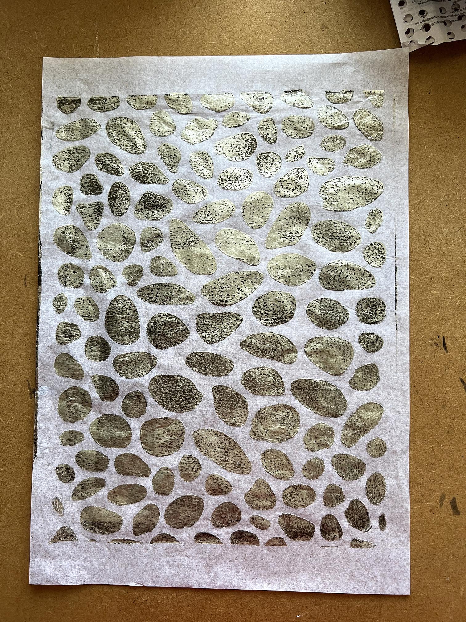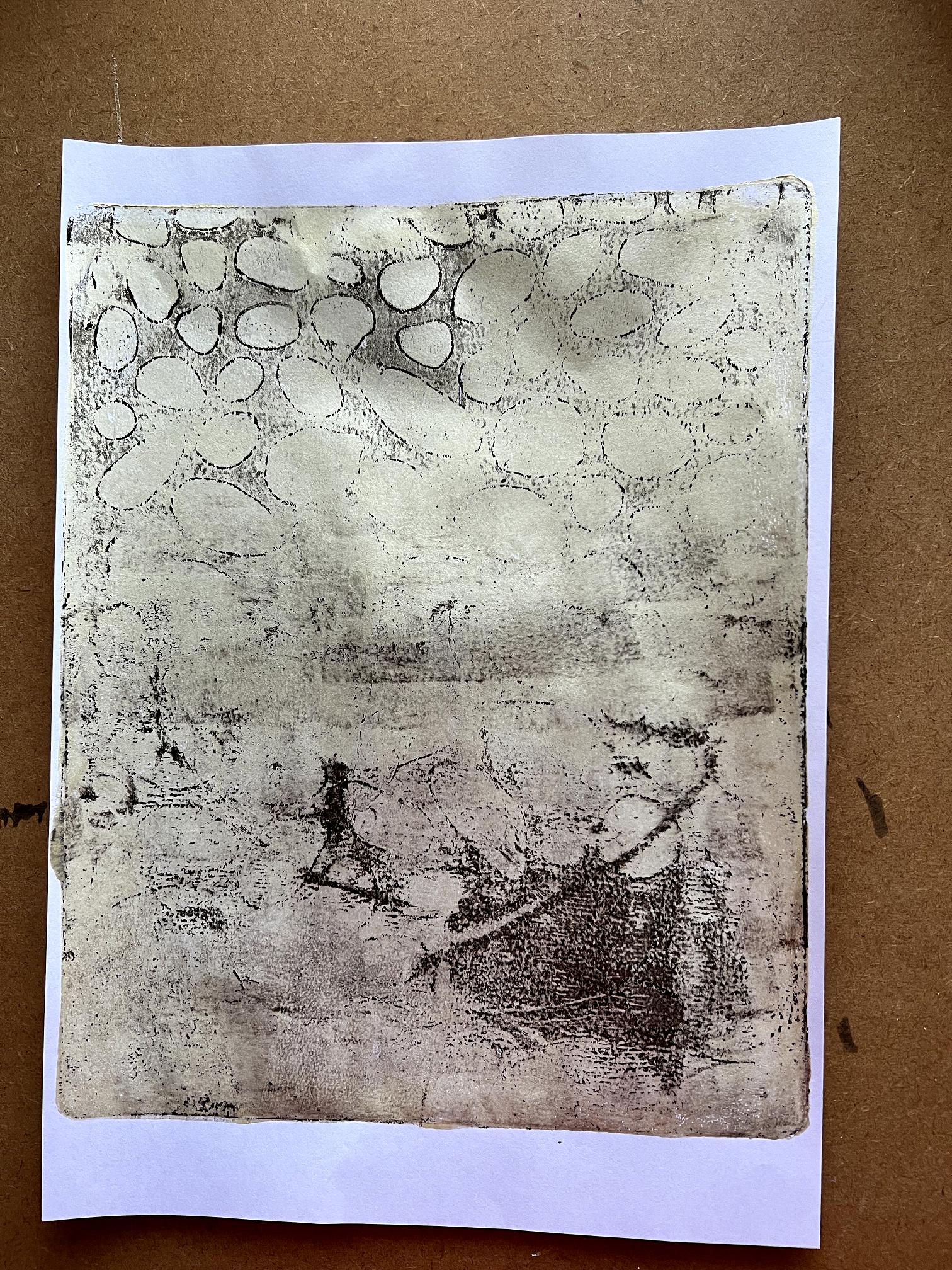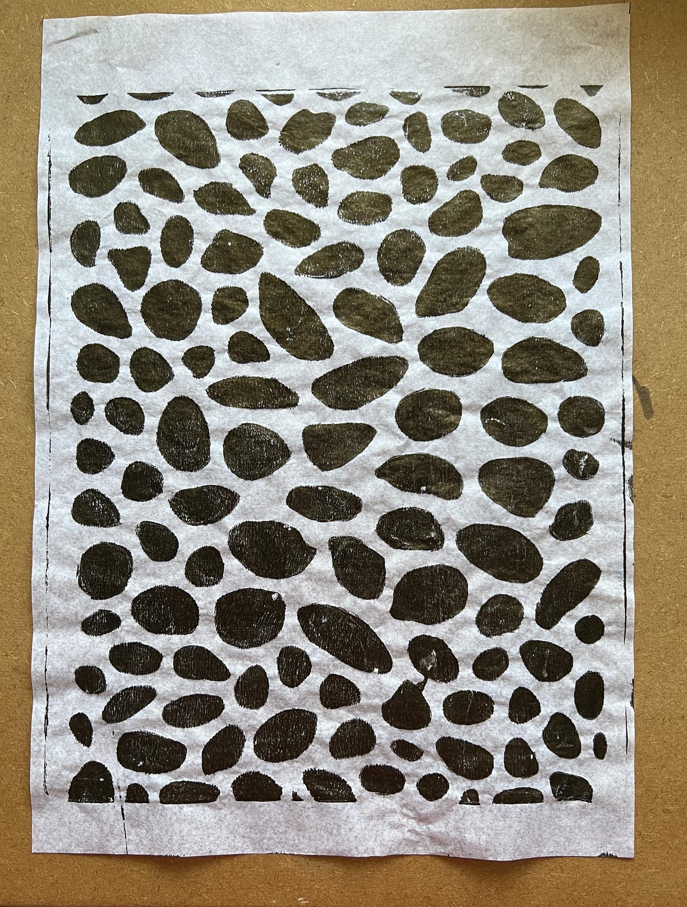 Brayering on more cream and black (without over-cleaning the brayer) and pulling a fairly plain backgound. You can just see the pebble outlines on the upper half.