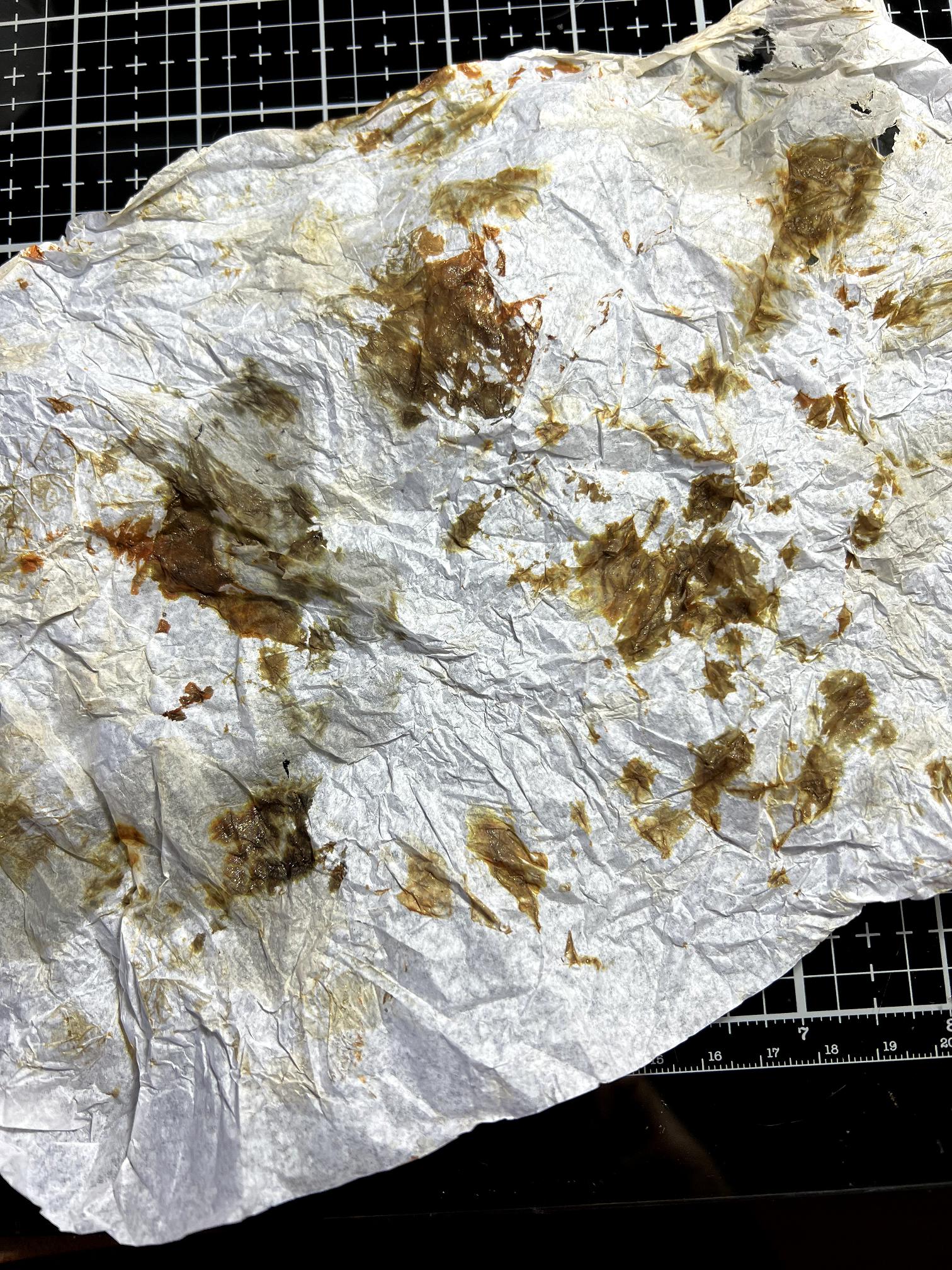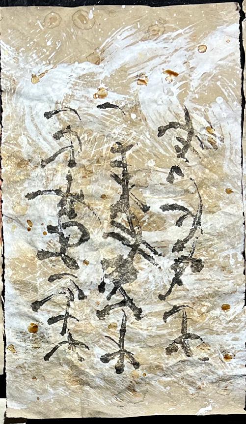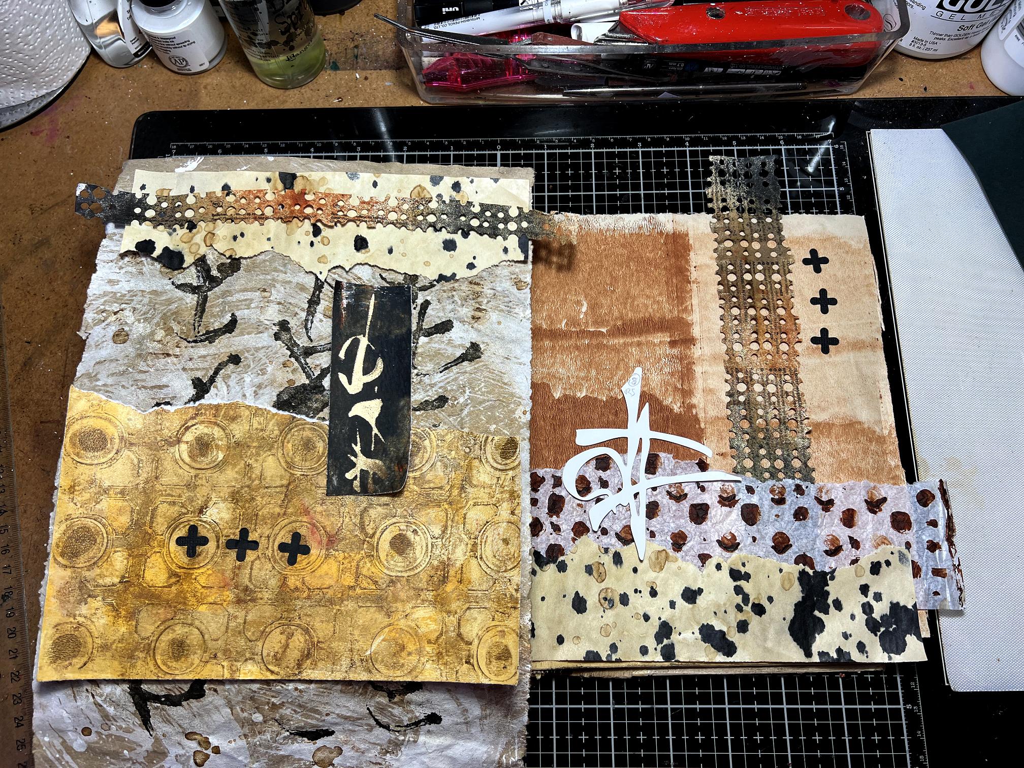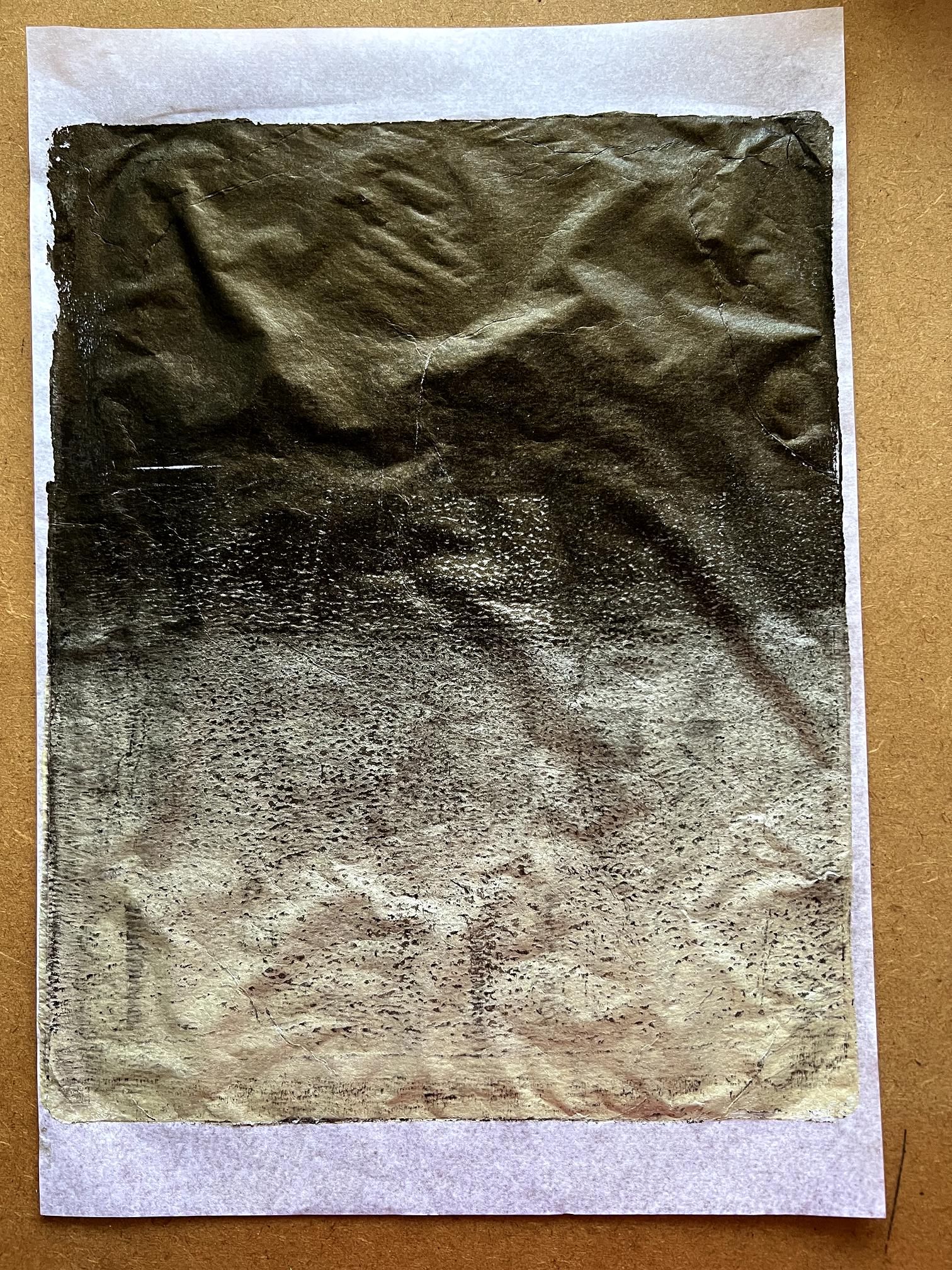 I ceated this during a mark making session a few weeks ago. It is Amazon packaging paper with white acrylic paint using a silicone pastry brush, intuitive scripting, and coffee staining. It is crinkly and delicious!