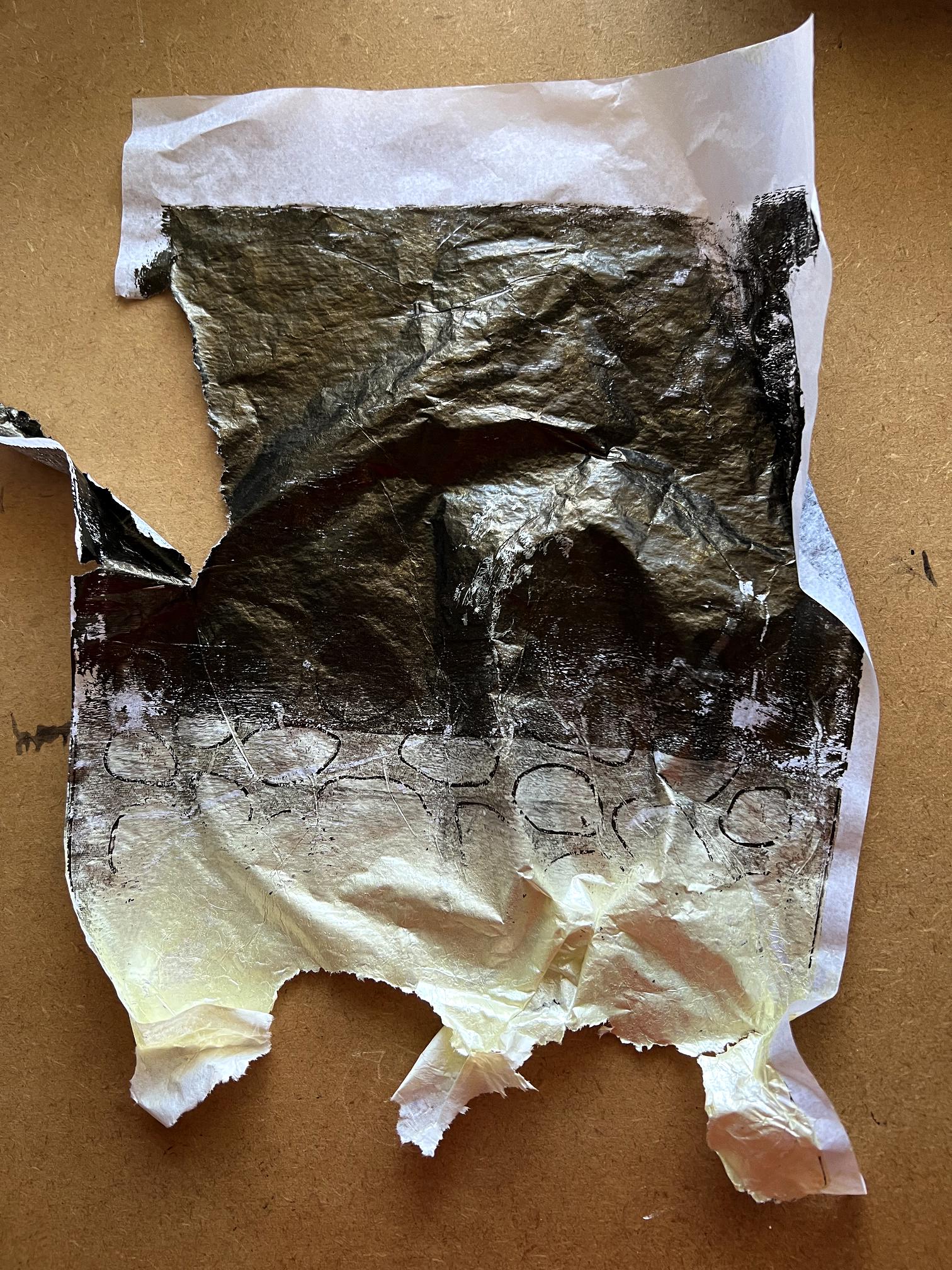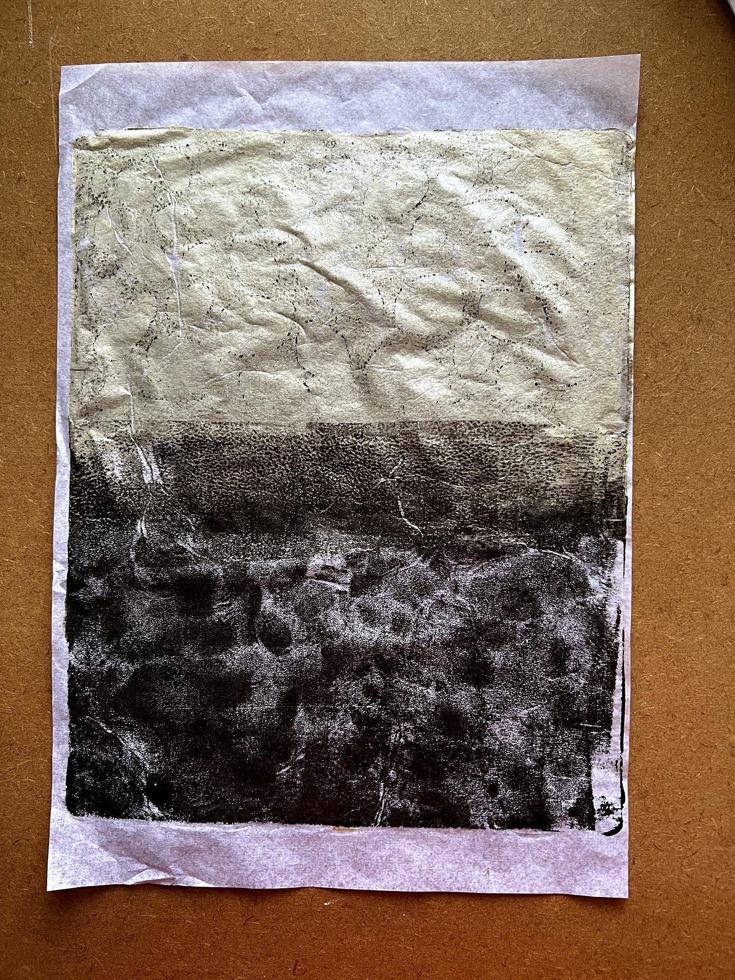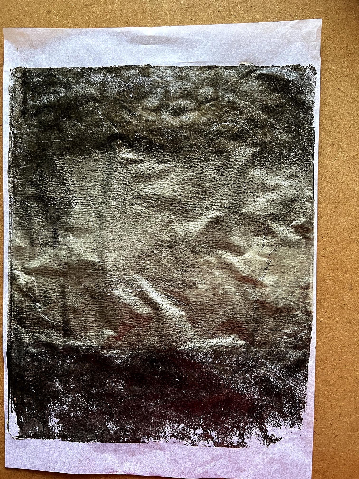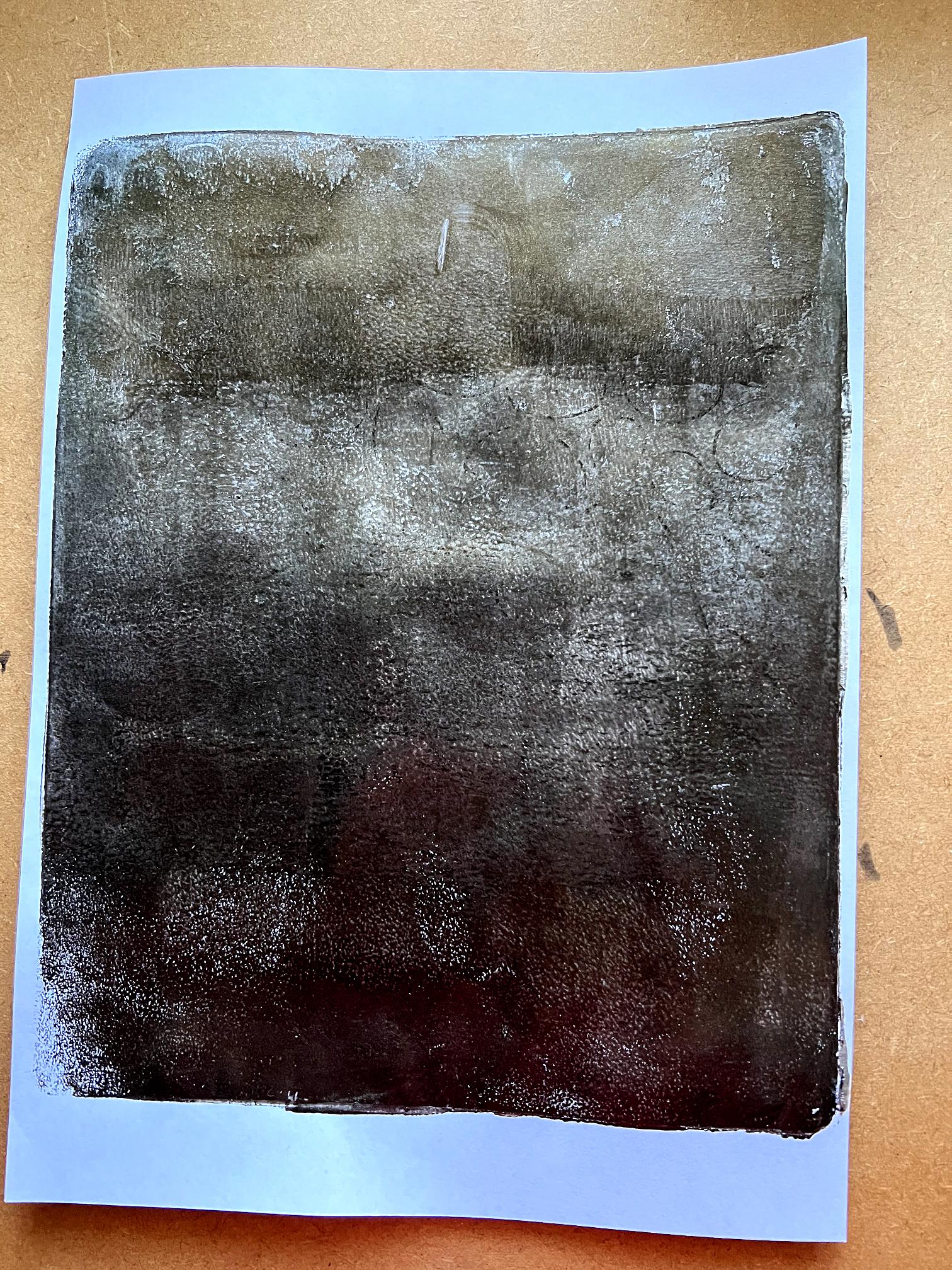 I overlaid the remaining paint with an ombre effect of black and cream and pulled a print with tissue paper. Total disaster! The whole thing ripped. I can probably use some of it.