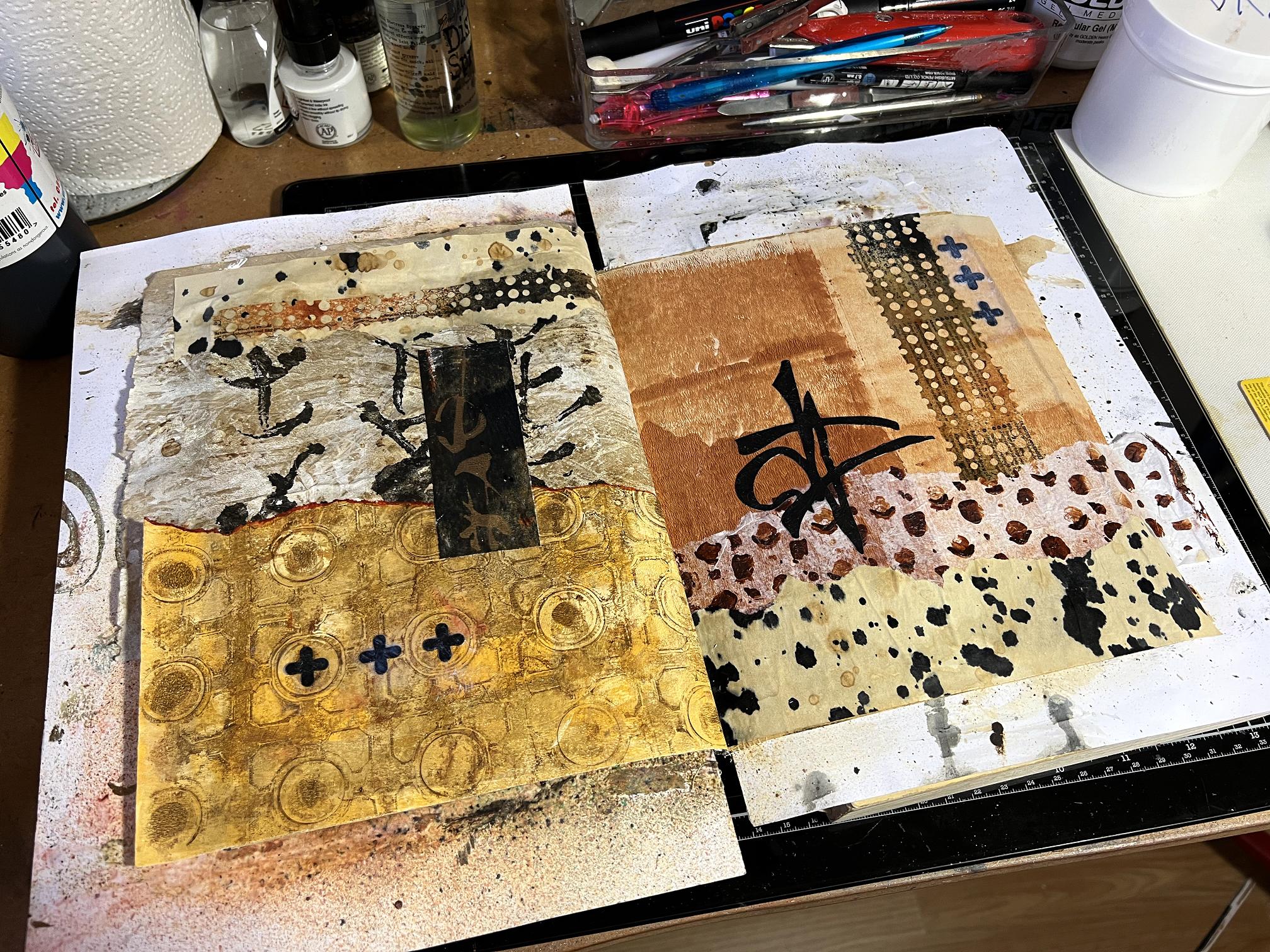 I didn’t like the white torn edge along the top of the bathmat gel print on the left-hand page so I painted this with some Golden quinacridone nickel azo gold which is a gorgeous rich-coloured translucent paint.
