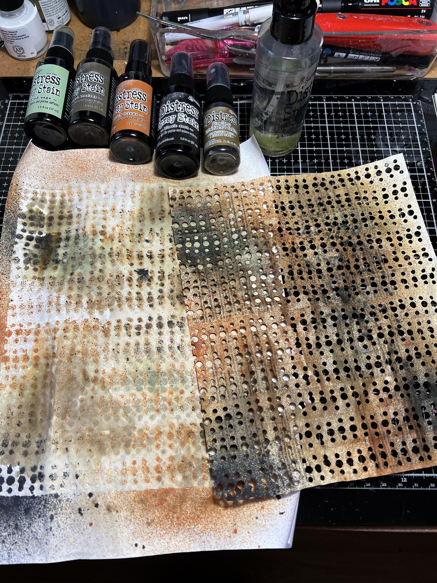 I took this sheet and sprayed it with coffee and then with the spray inks you can see in the photo, spritzing with water to help the colours move.