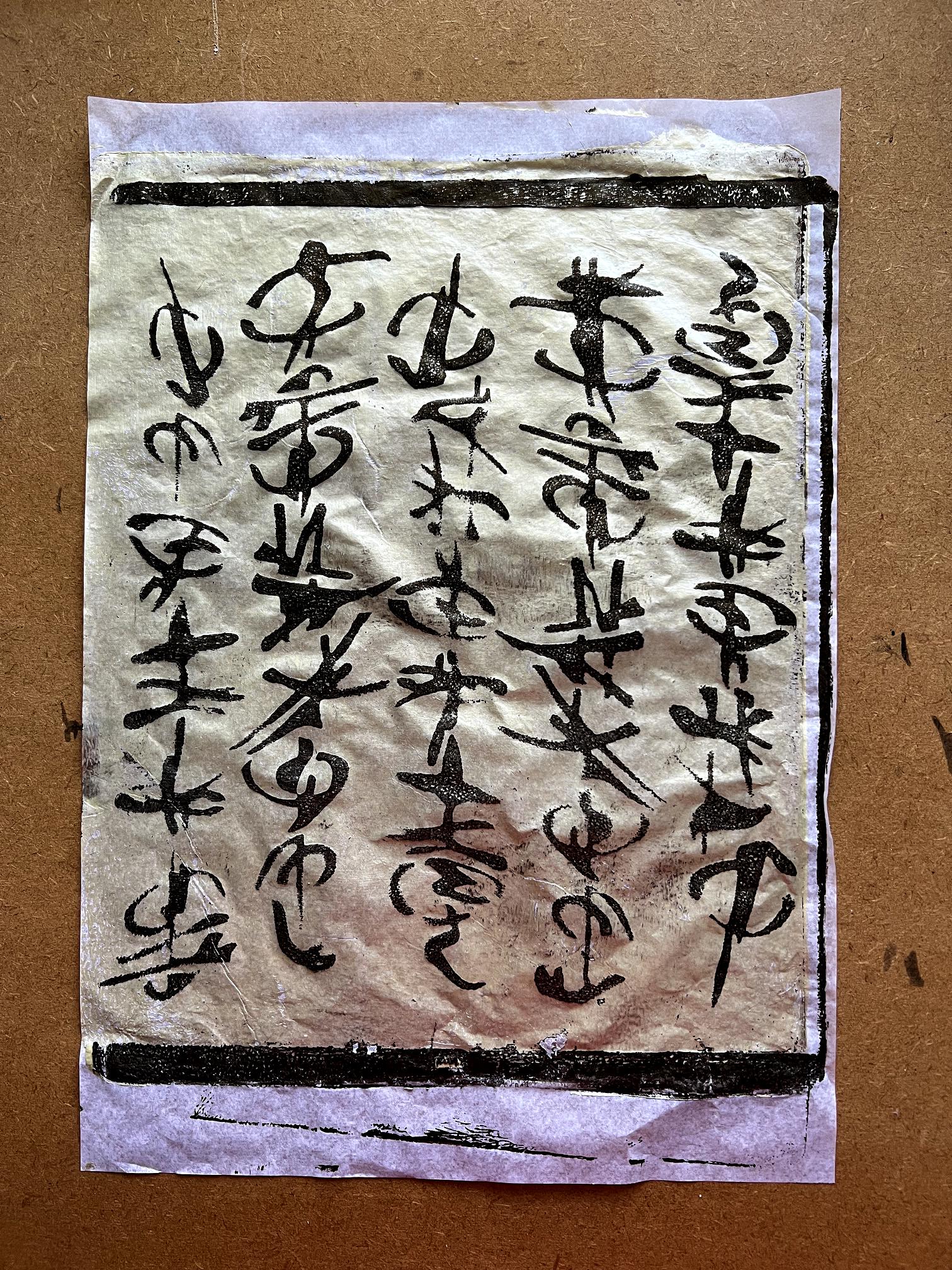 This has to be my favourite print of the day. I used my first Oriental Script stencil for the first time and love how it came out, using the same technique as before – black all over the plate, stencil, then tissue to pick up the paint through the holes.