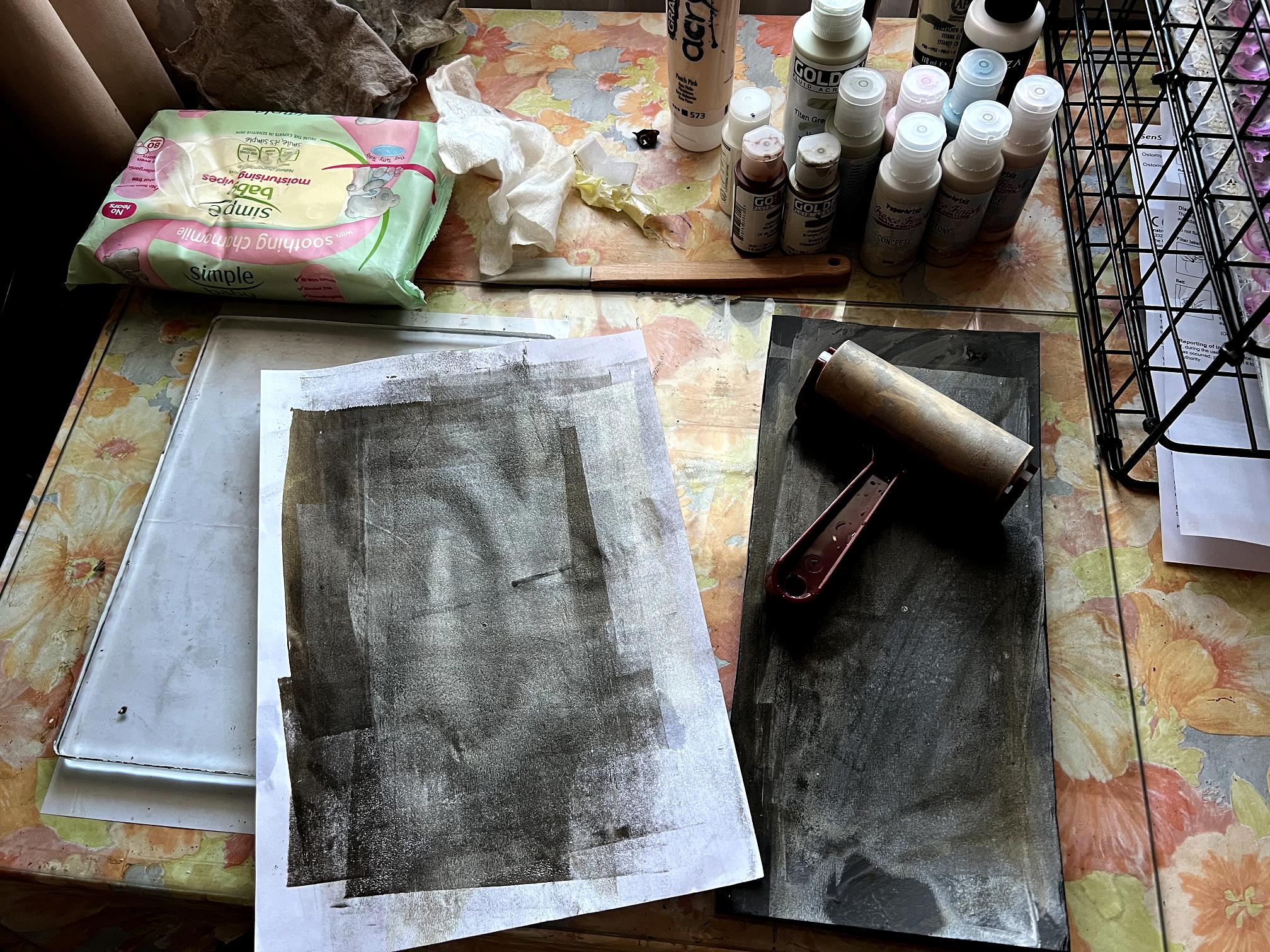 In the meantime, for today’s gel printing session, I used the smaller offcut beside the gel plate to clean off the brayer and print off the ink on scrap printer paper. Here’s the gel printing table at the end of the session.