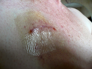 Because the surgery had only just been done when the treatment began, there was some bleeding from the incision over the port, so when the treatment was finished, they removed the dressing (using some of the adhesive remover spray from my emergency stoma kit!) and a fresh, temporary dressing applied. I have to go back tomorrow morning for this to be removed, the wound checked and cleaned, and a new dressing applied. The small incision at the base of my neck is fine and doesn’t need touching. They will also flush the port at the same time.