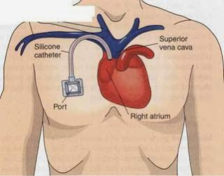The port-a-cath is a port, a small implantable device which is inserted under the skin of the chest, with a silicone rubber membrane through which a needle can be inserted for the administration of medication and the withdrawal of blood. Attached to the port is a catheter which leads into the subclavian vein on the right-hand side of the chest, and then into the superior vena cava, the main vein leading into the heart. Introducing chemotherapy into the body in this way is preferable to the use of peripheral veins because of the toxicity of the drug which can cause damage to the more delicate tissue of the smaller vessels.