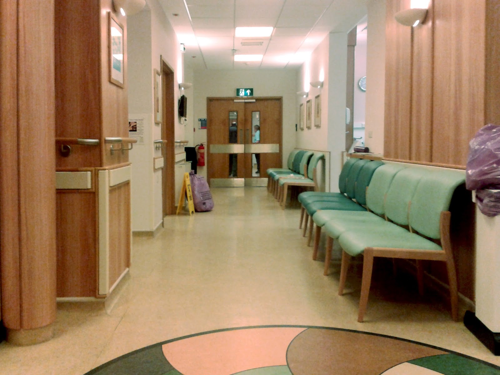 Looking back the other way from reception, you can see the wide corridor that also serves as the waiting area. As usual in every hospital waiting room I have ever been in, there are NO spaces to park wheelchairs, with the result that I ALWAYS feel as if I’m in the way! I have written this on numerous feedback sheets but so far nothing has happened to remedy this – considering how many disabled people attend hospitals, I think this is quite an oversight. On the far right of the foreground of this photo you can see the large rubbish bin, the space in front of which has become my favoured parking place! (Make of that what you will, lol!)