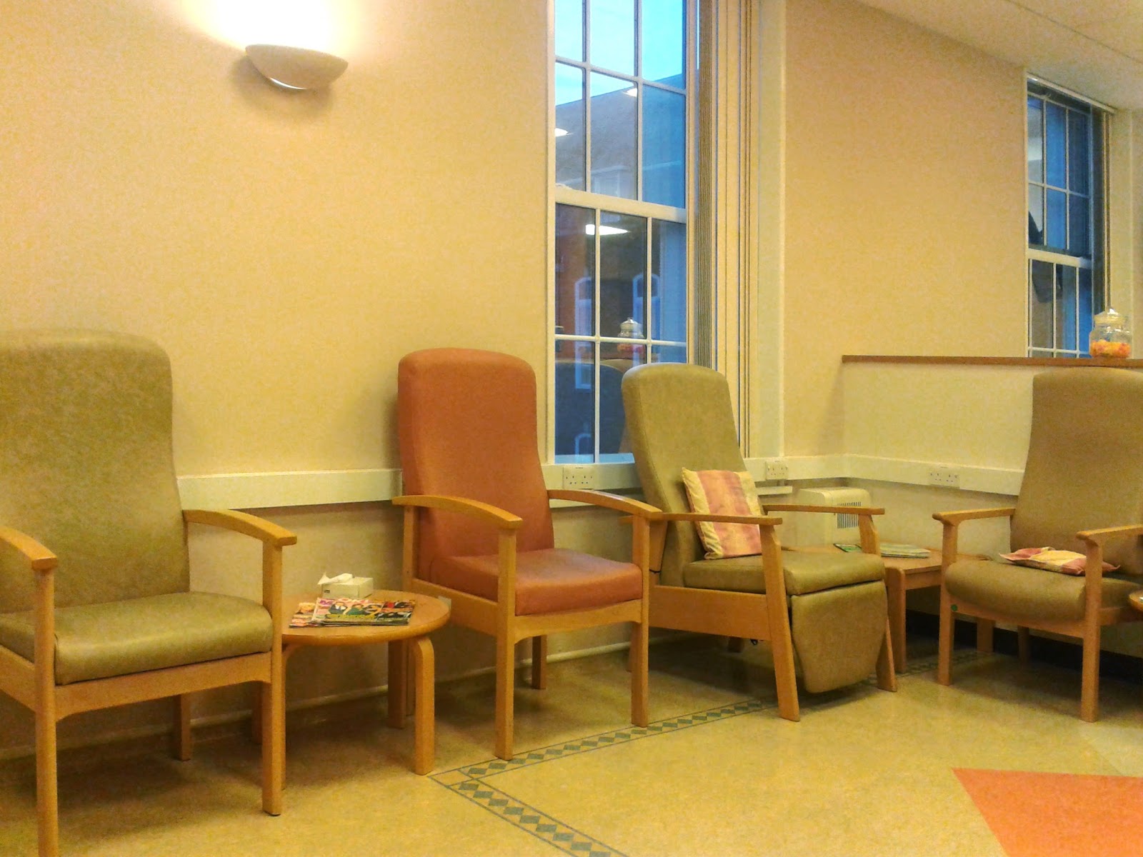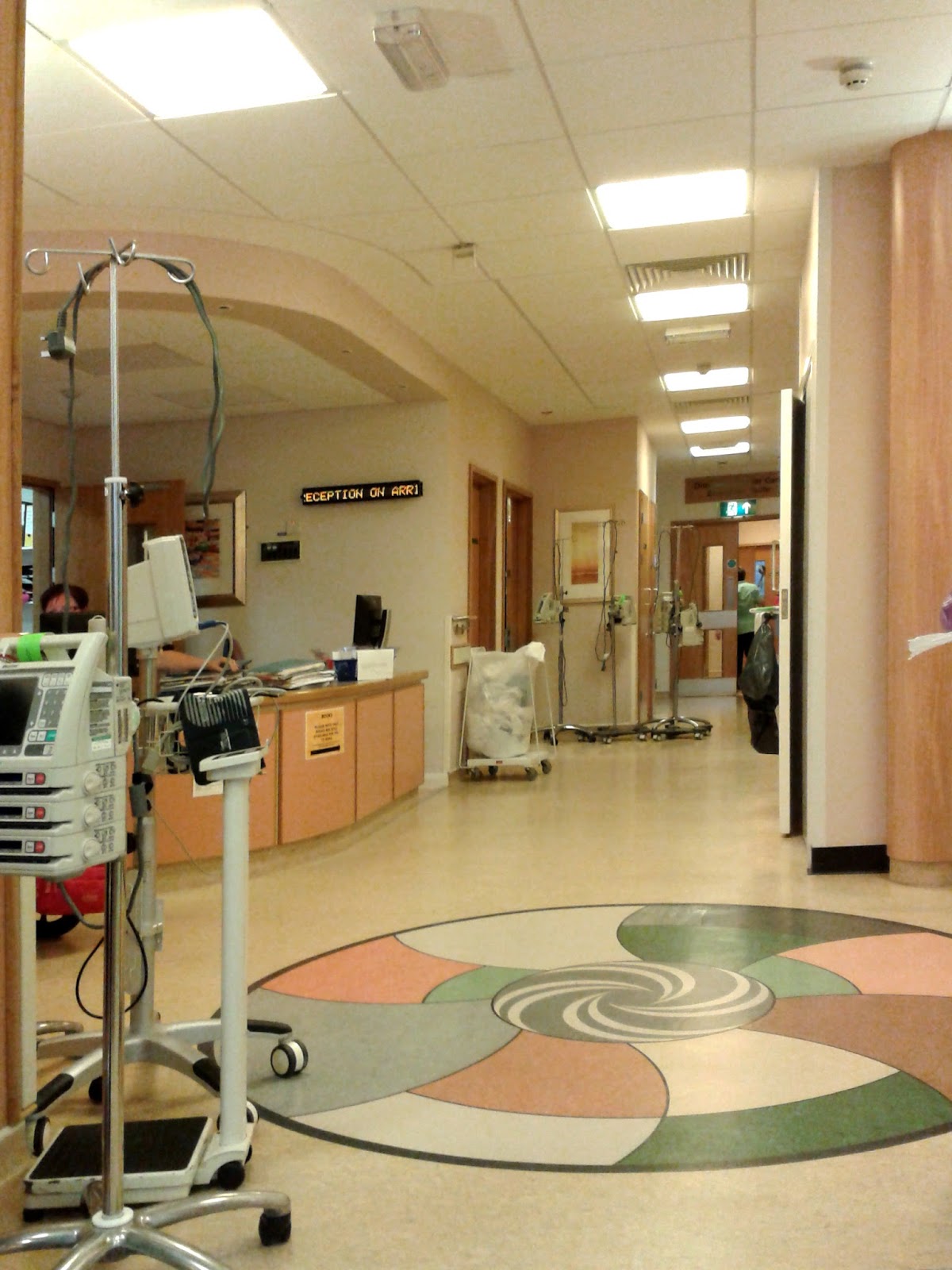 Here are the photos I took of the Ricky Grant Day unit (looking very strange with no patients!) – you will see what a lovely place it is, and how they have gone to a lot of trouble to introduce restful pastel shades, and a lot of pale wood panelling, to make it look less clinical. The first photo shows the corner of the reception desk, looking down the further corridor, which has doors off to the right with separate treatment rooms, some of which have couches in them for people to rest on while they have their chemo – I used one of these for my first session when I was still a bit woozy from the anaesthetic when I had the port fitted. You can see the IV poles on the left, which hold the bags of chemo and other medications for infusion, and blood for those having blood transfusions.