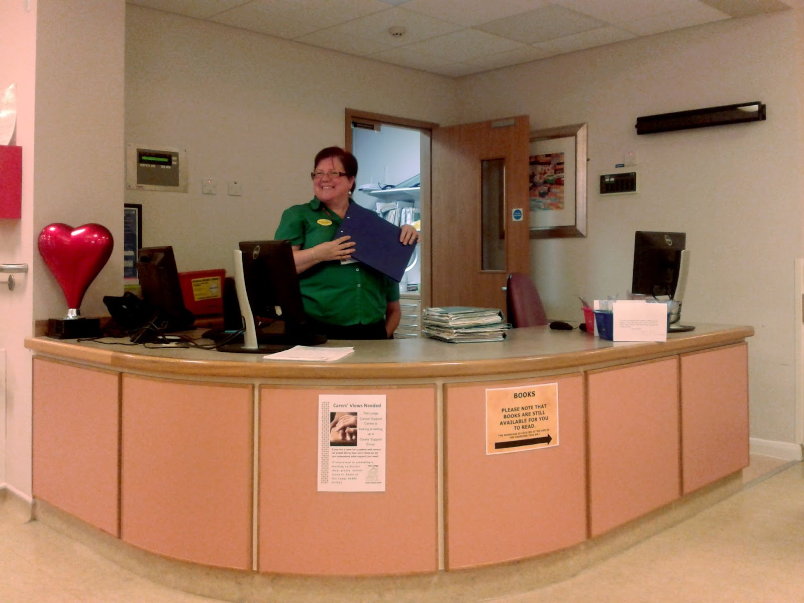 Here is Emma, my favourite reception clerk, at the desk. If you look carefully it looks as if she’s got three arms. This is because one of the nurses was hiding behind her, unbeknownst to her, and raising two fingers above her head, which you can just see if you look very carefully! Lol!
